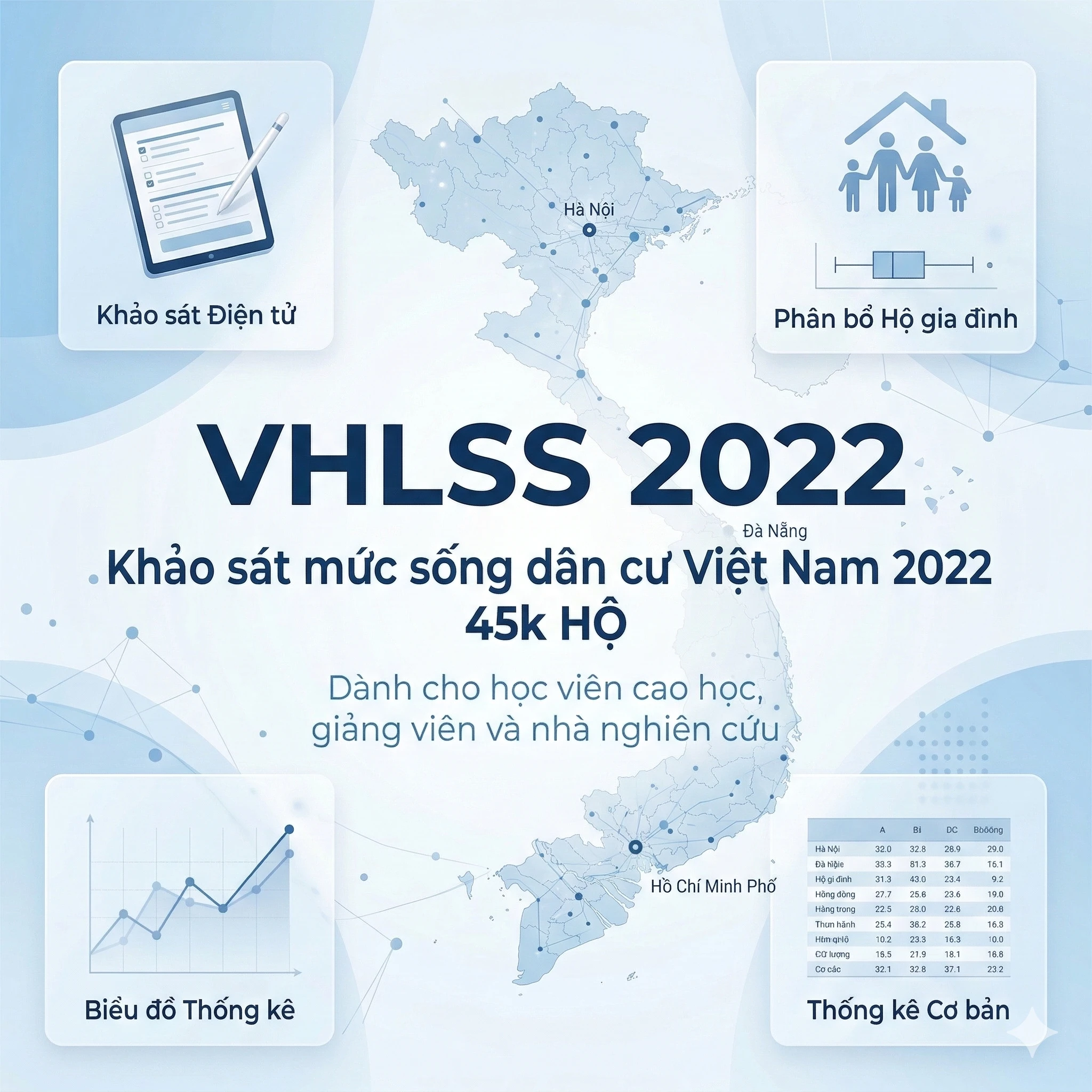 Khảo sát mức sống dân cư năm 2022 được thực hiện trên gần 47.000 hộ (46.995 hộ), đại diện cho toàn quốc, khu vực thành thị – nông thôn, 6 vùng địa lý và từng tỉnh/thành phố trực thuộc Trung ương; bản “45K hộ” là trích xuất từ chính khung mẫu đại diện này. Thiết kế mẫu là điều tra chọn mẫu với phân tầng và chọn mẫu hai giai đoạn, đảm bảo khả năng suy rộng cho các cấp độ từ toàn quốc, vùng, khu vực thành thị – nông thôn tới cấp tỉnh, đáp ứng yêu cầu nghiêm ngặt của các nghiên cứu hàn lâm và phân tích chính sách.